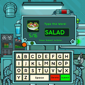 Can you survive a shift in the Spelling Lab?.. Players must correctly spell sixteen vocabulary words within a given time limit in order to maintain equilibrium and keep things running smoothly in the lab (with the help of a friendly robot). The situation in the lab progressively deteriorates with each mistake.. Too many mistakes will lead to disaster... This game may be a little stressful and scary for younger students. I recommend that you do a lot of practice with the work sheets provided on this site to make sure that the students can spell the vocabulary reasonably well before they play the game.